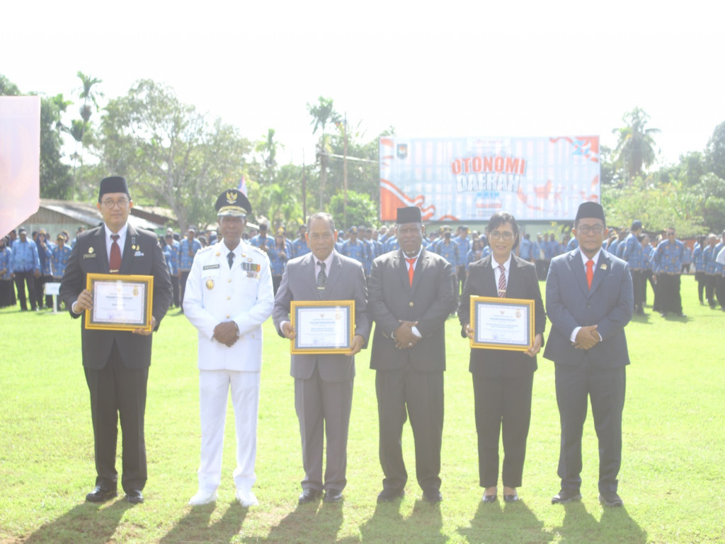 Merauke, Suara Bentara | Gubernur Papua Selatan, Apolo Safanpo, menyerahkan piagam penghargaan kepada tiga Organisasi Perangkat Daerah (OPD) yang meraih nilai tertinggi dalam evaluasi kinerja pemerintah daerah tahun 2024. Penyerahan dilakukan usai upacara peringatan Hari Otonomi Daerah (Otda) ke-29 di Lapangan Kodim 1707/Merauke, Jumat (25/4/2025).