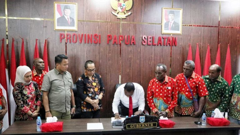 Merauke, Suara Bentara | Gubernur Papua Selatan Apolo Safanpo menyatakan dukungan penuh terhadap rencana Koperasi Inggyash Ghuzi membangun kebun plasma kelapa sawit seluas 4.600 hektar bagi masyarakat 9 marga di Distrik Ulilin, Kabupaten Merauke. Dukungan itu disampaikan saat Gubernur menerima pengurus koperasi dan para ketua marga dalam pertemuan di ruang rapat Kantor Gubernur Papua Selatan, Jumat (2/5/2025).