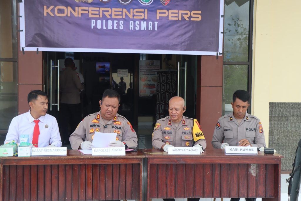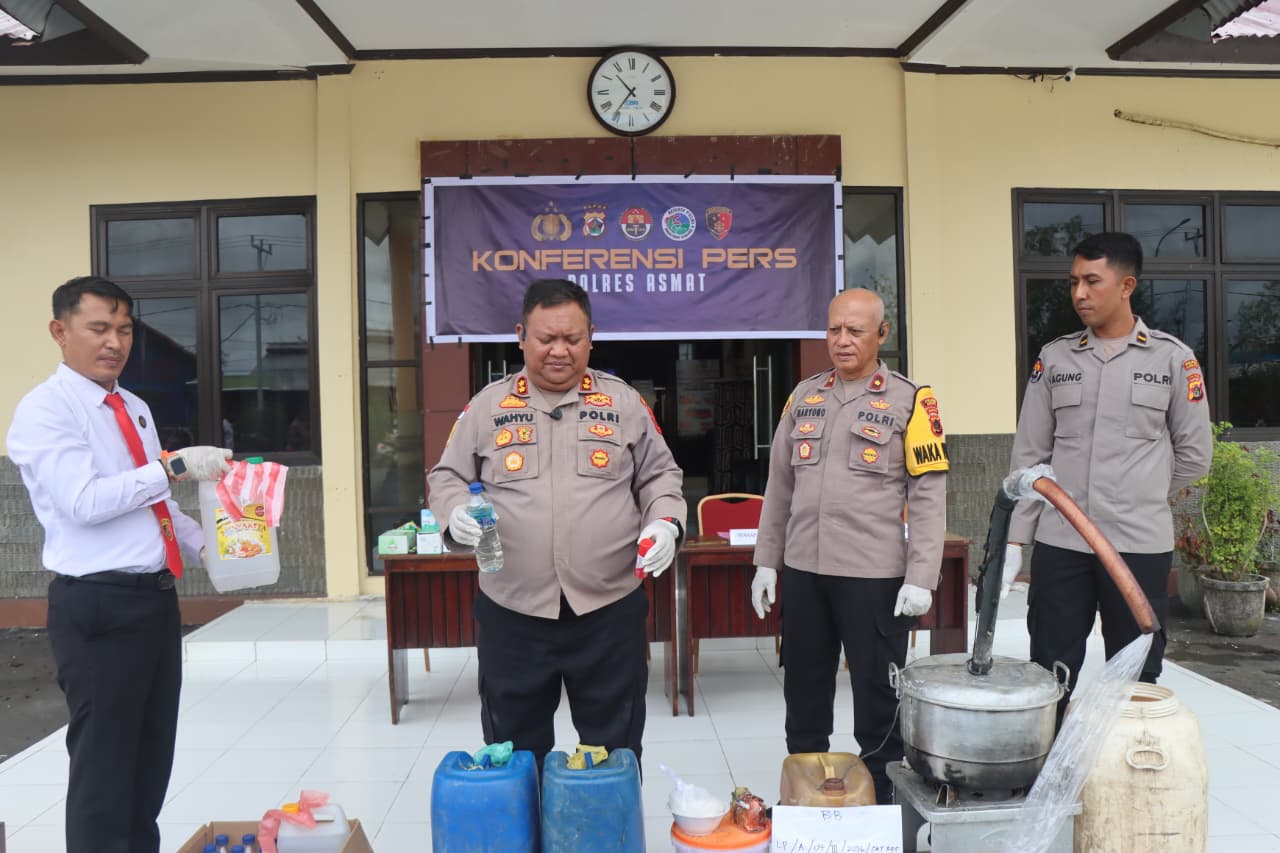 Kapolres Asmat, AKBP Wahyu Basuki SIK, dalam konferensi pers, Senin (30/3/2026), menjelaskan bahwa tersangka D diamankan di Jalan Kompas, Distrik Agats, pada 20 Maret 2026 karena kedapatan menjual miras lokal jenis sopi kaki anjing.