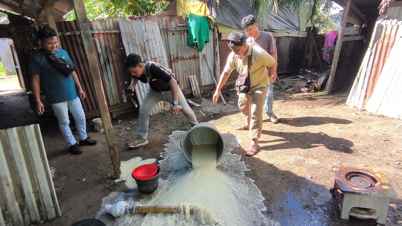 Sementara itu, di Jalan Buti, petugas menemukan sejumlah peralatan yang diduga digunakan untuk memproduksi sopi, antara lain kompor, panci berisi rendaman, ember, bambu, jerigen berisi minyak tanah, plastik, serta bahan berupa tepung terigu. Seluruh peralatan tersebut turut diamankan untuk kepentingan penyelidikan lebih lanjut.